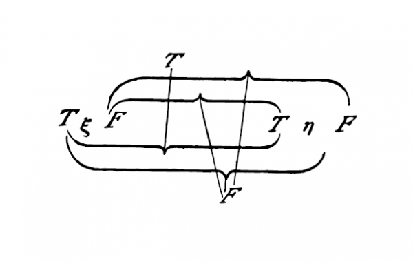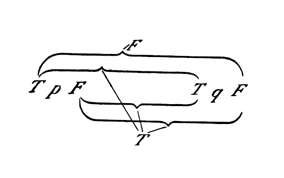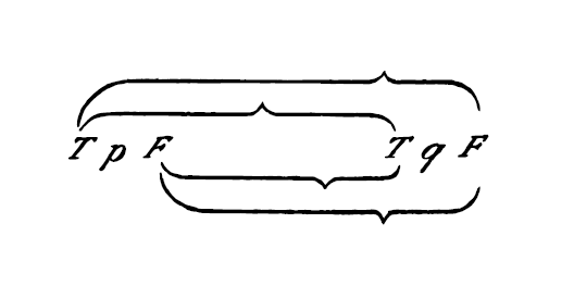 Setzen wir hier statt „q“ „p“ ein und untersuchen die Verbindung der äussersten W und F mit den innersten, so ergibt sich, dass die Wahrheit des ganzen Satzes allen Wahrheitskombinationen seines Argumentes, seine Falschheit keiner der Wahrheitskombinationen zugeordnet ist. | ||||||||||||||||||||||||||||||||||||||||||||||||||||||||||||||||||||||||||||||||||||||||||||||||||||||